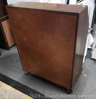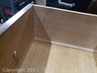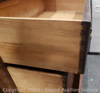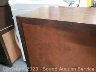 Solid wood construction. Dovetail joinery. Olde patina. Some minor scuffs, wear to finish. 38.5" H x 29" W x 15.5" D.