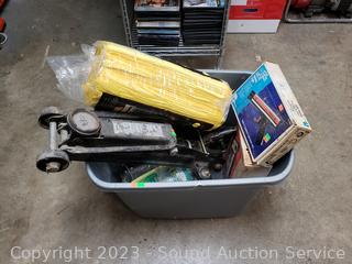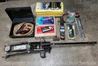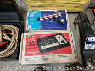Engine Analyzer, Timing Light, 36pk Microfibre plush towels, Hydraulic floor jack, 2" coupler Ball mount w/1-7/8" ball. Signs of wear from use.