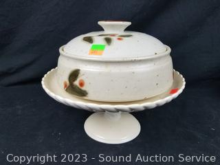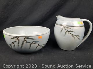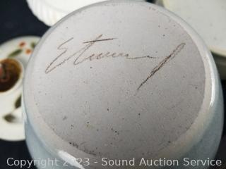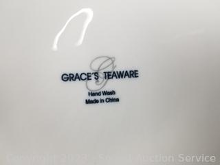 Blue pitcher & bowl are signed. Cake plate is marked Grace's Teaware. Others unmarked, some crazing.