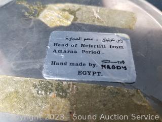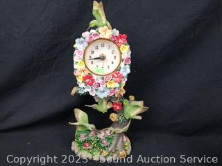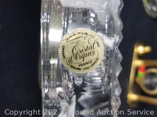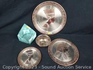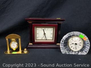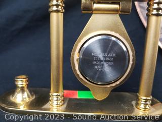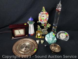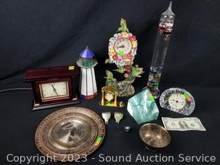 Staiger, Korean Air, Bird Clock, Other. Gold clock untested, bird clock not working, other clocks work. 9.5" stained glass lighthouse lamp. Egyptian plates, Maya calendar paper weight.