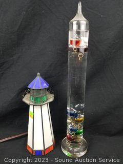 Lot #0208: Clocks, Lamp, Galileo Thermometer, Decor