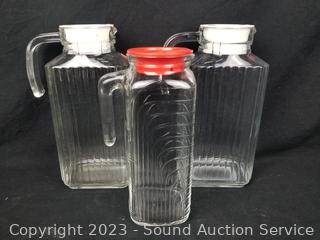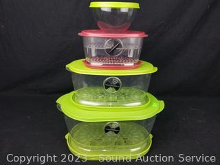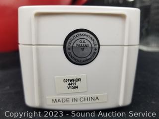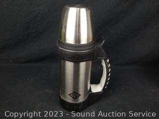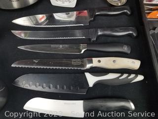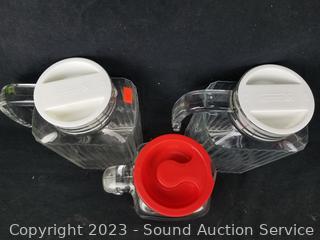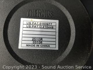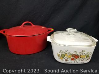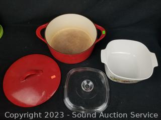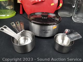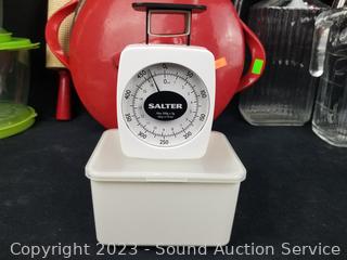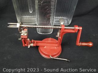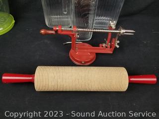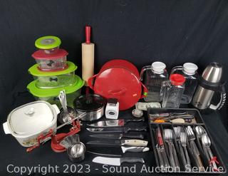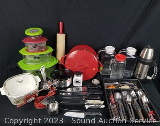 Cast Iron enamel covered pot, storage containers, apple peeler, measuring cups, utensils, rolling pins, drink containers, thermos & more. Refer to photos for lot contents.