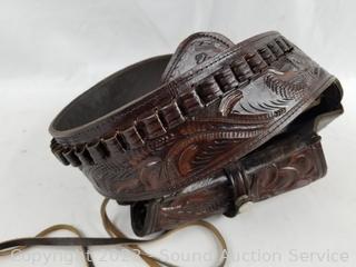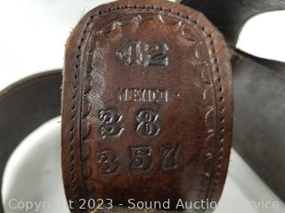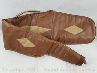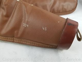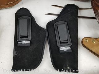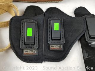 2 leather pistol holders (1 is a Bianchi X15 shoulder holster, other has belt, nicely tooled leather). Small leather holster & 3 side kick neoprene/nylon holsters, 46" rifle case, wood stock 29" long. Refer to photos for more info.