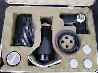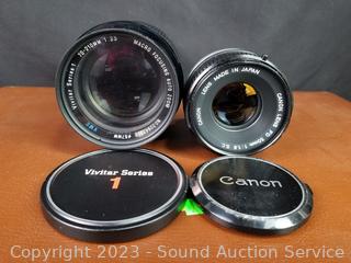 Vivitar Series 1 70-210mm 1:3.5 lens, Canon 50mm 1:1.8 lens, Vivitar 200M Thyristor 285 flash, Sunpak 800IUT & other tripods.