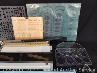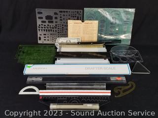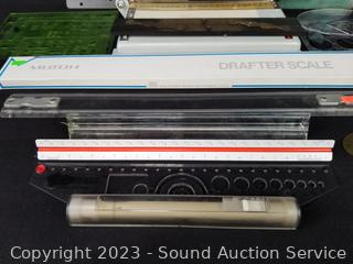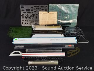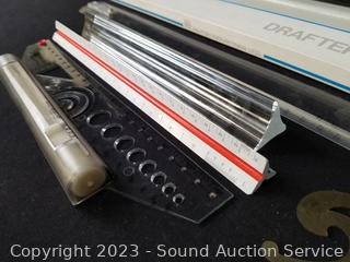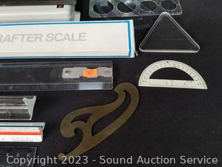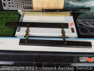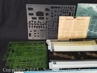 Drafter scale, stencils, straight edge, paper cutter. Refer to photos for lot contents.