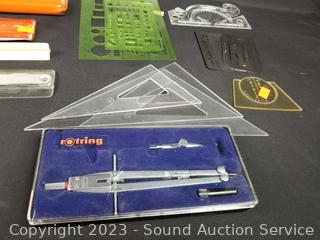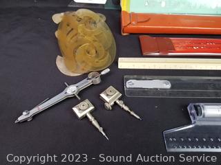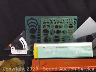 Stencils, Kueffel Esser Slide Rule, Compass & more, refer to photos for lot contents.