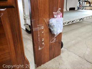 Particle board construction, laminate cherry finish. Don't see any major issues. Headboard set up for twin or full. 44" H x 62" wide overall. 22" H x 23" W x 15" nightstands. Matches the previous lot.