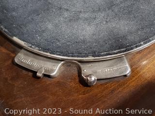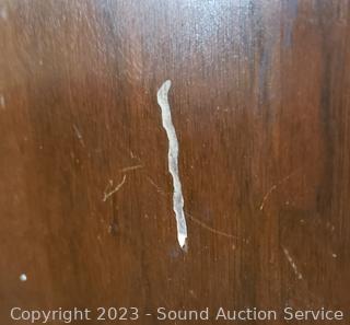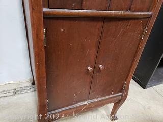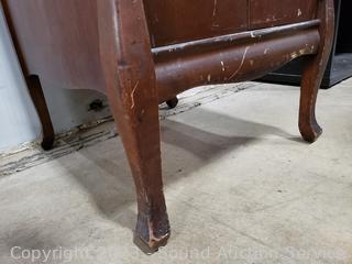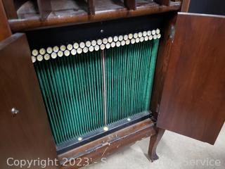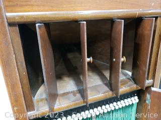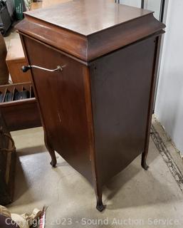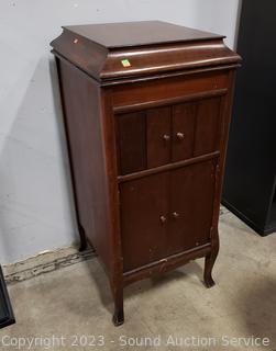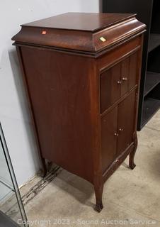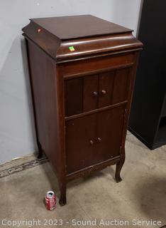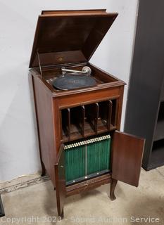 Appears to be working as intended. Record storage in the bottom. Some scuffs, wear to finish, overall good condition. 43" H x 19" W x 21" D.
