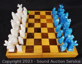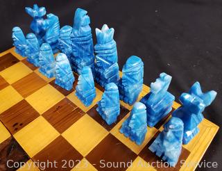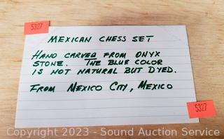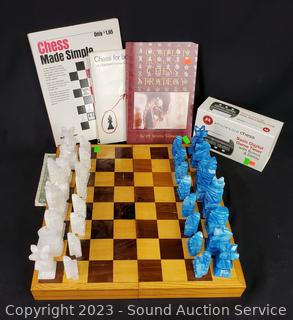 Mexican Chess set hand carved from onyx stone, blue piece are dyed, from Mexico City Mexico. Basic Digital Game Timer, 3 Chess Books.