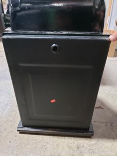 Caast iron construction. Old time pull lever dime feed slot machine, works. Comes filled with dimes. Back is loose, lock has been removed, don't need a key to open. 26"H x 15" W x 13" D.