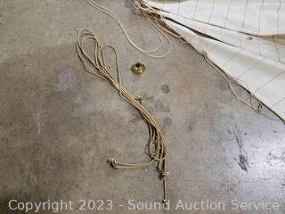 Sails are not attached, will need some assembling, looks complete. Approx. 38" H overall (with 32" mast), 40" long.