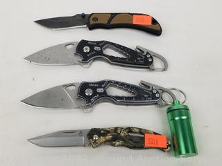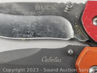 Brands include Kikkerland, Chasm, Bass Pro Shop, True, Gerber, Accu Sharp, Buck, Victorinox Swiss, Smith & Wesson. Signs of wear from use. Approx. 5.5" to 8" long overall.