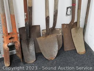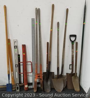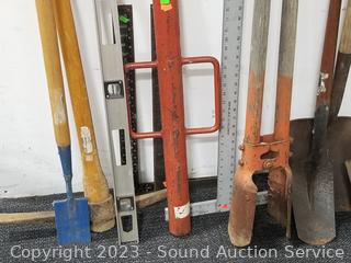 Spade Shovels, 4" scrapper, mattock, post hole digger, post pounder, digging bar, 3ft level, carpenters & drywall squares. Signs of wear from use.