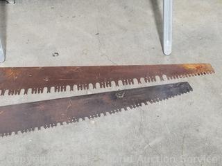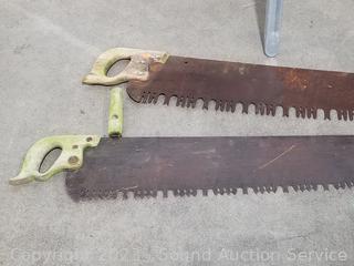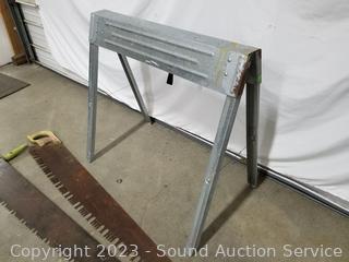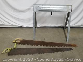 Lot #0099: 2 Vtg. Cross Cut Saws & Metal Folding Saw Horse