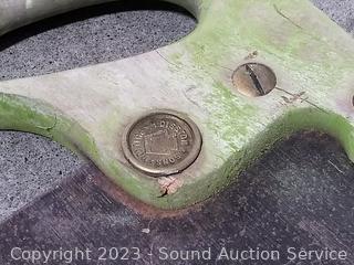 1 the handle is marked Disston, other unmarked, both with 4.5ft blades. All with some rust, wear from use. Approx. 34" H x 34" W sawhorse.
