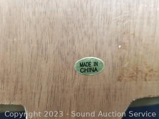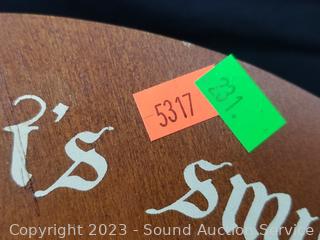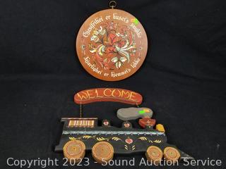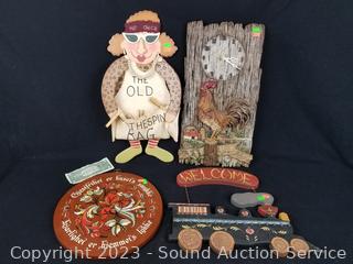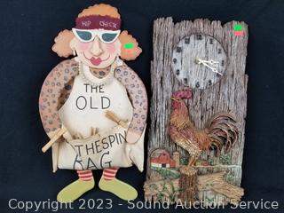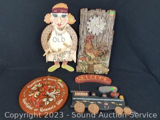 The Old Clothespin Bag w/Clothespins, 20.5" H x 11.5". Hand Painted Train "Welcome" sign 12.5" H x 16". 12.5" dia wood German sign, 10" H x 10" rooster clock (not functioning).