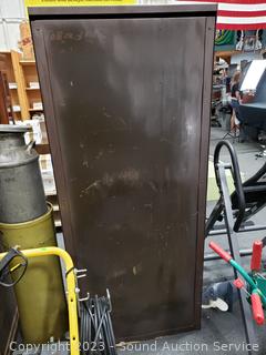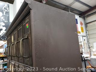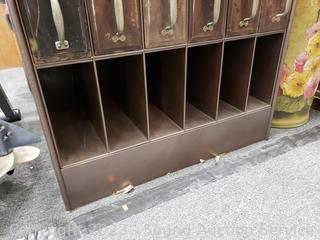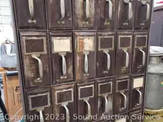 Various wear to the finish due to age, use. Bottom 6 cubbies do not have drawers. 73" x 31" x 14". Metal construction. Interior drawer dimensions approx. 10" T x 4.5" W x 13.5" D.