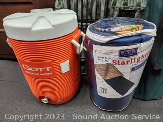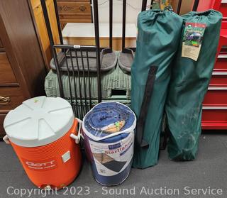 2 folding camp chairs, sleeping bag, Gott 5 gal. drink dispenser, Trailstar Gaiter, Hi-Viz felt fanny pack, pouch. Refer to photos for more info.