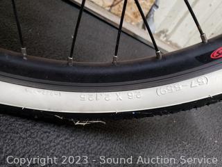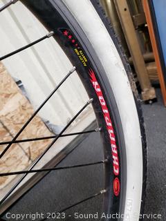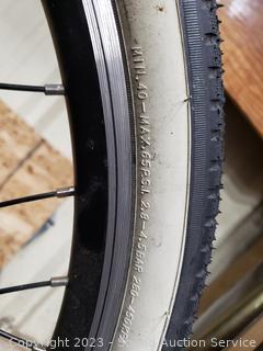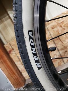 Kenda Champion white wall 26" tires, Wuxing cantilever brakes, cable lock w/key, speedometer, odometer. Everything functions as intended. Comes with charger & Cable lock (don't see a key). Light wear from use.
