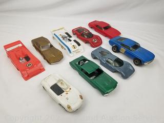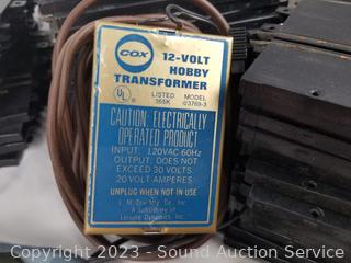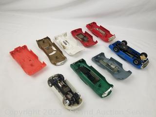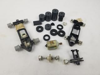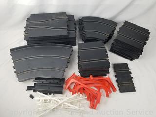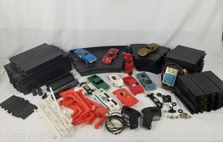 Unknown condition, or completeness, Comes with some track, track accessories, 2 slot car motors, 6 bodies, 3 controllers, transformer & other parts. Refer to photos for more info.