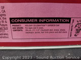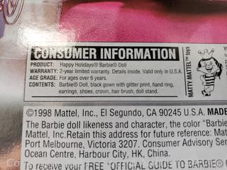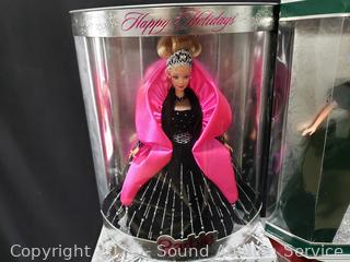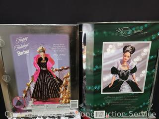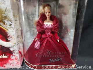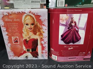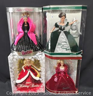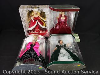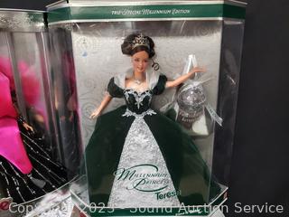 1998 Special Edition Happy Holiday Barbie (some wear to packaging), 2007 Holiday Barbie, 1999 Millenium Princess Teresa (package has been opened), 2002 Holiday Celebration Barbie (sealed).
