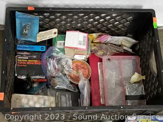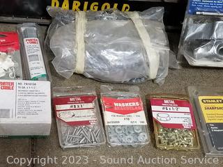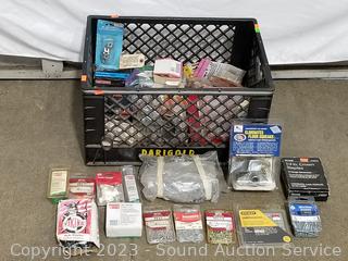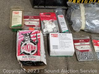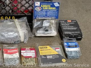Shelf pegs, screws, staples, finish nails, washers, barrel bolt, fuses & more. Refer to photos for lot contents.