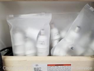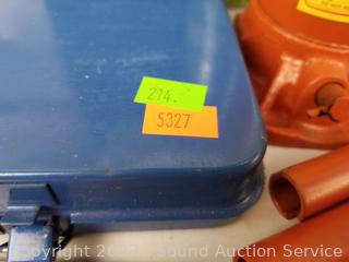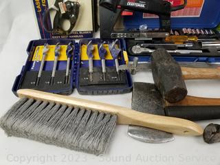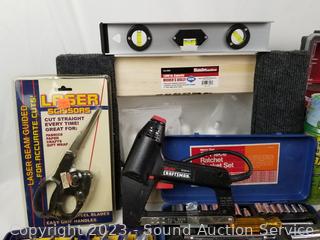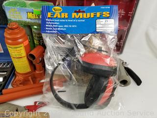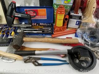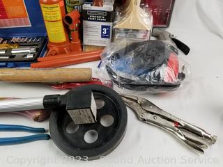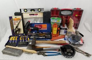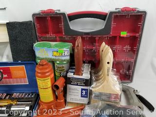2" x 16.5" x 13" organizer. 2 Maxfill expanding foam. Assorted unused paint brushes, tote full of tools, bottle jack, mallet, level, hatchet, scissors & more, 7" x 9" x 23" tote with lid. 18" x 11.5" 4-way dolly. Craftsman pole saw blade, socket set. Light socket adapters & more.