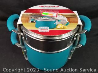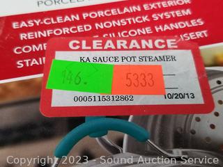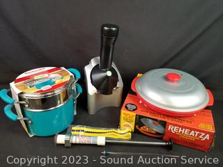 Turquoise KitchenAid 3qt Covered Saucepot, Reheatza Microwave Crisper, Onanas Dessert Maker, Pump & Seal Machine.