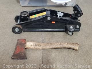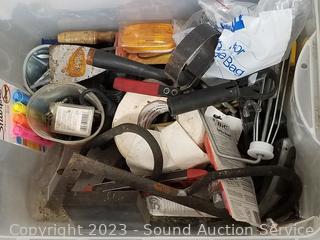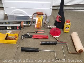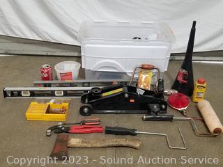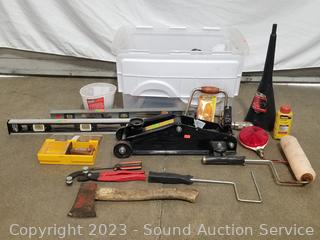 Levels, hydraulic floor jack, paint rollers, hatchet, brace, funnel & more. Refer to photos for lot contents.