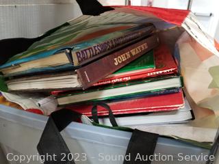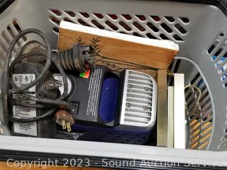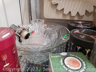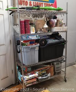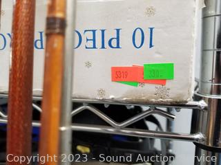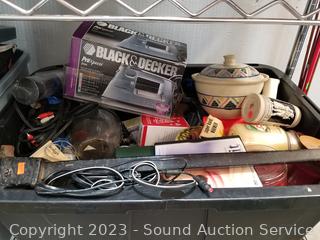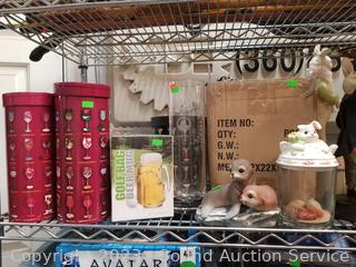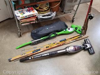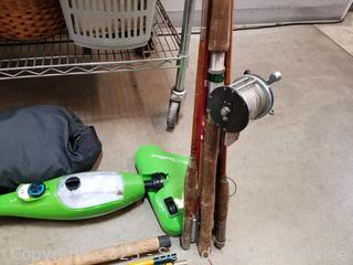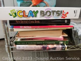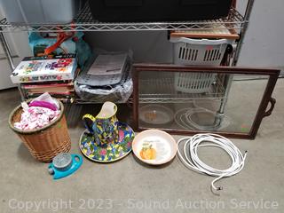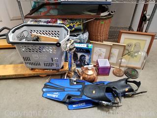 Hardwood floor cleaner, wine & martini glasses, assorted decor, books, fins, fishing rods, baskets, pitcher, Avatar board game, picture frame, roaster & more. ATTN: Items may be missing pieces, damaged, not functioning, complete, no issues, etc. All items as is. Refer to photos for lot contents. Cart NOT included.
