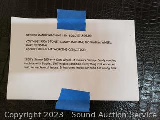 Lot #0002: Rare Vtg. 1950's Stoner Candy Machine 180 w/Gum Wheel
