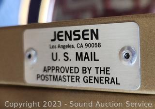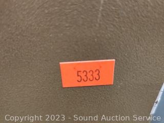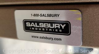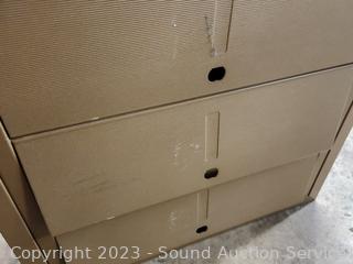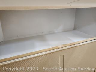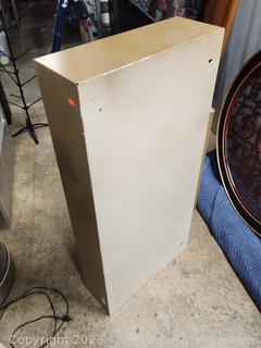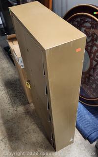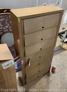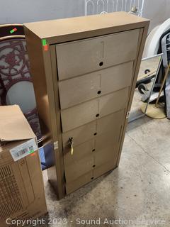 Main door locking with key, individual doors don't have locks (ready to install locks). Horizontal hang. 19.5" H x 41" W x 7" D. Some minor scuffs in finish.