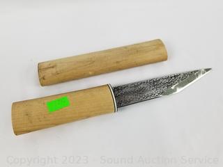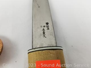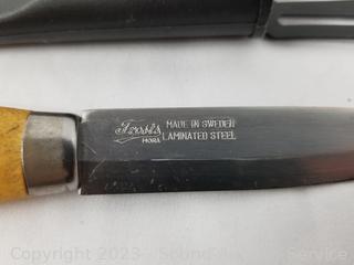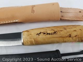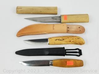 Japanese forged 9.25" long, 2.5" blade with wood sheathe. Frosts Sweden 7.5" long, 3.75" blade with plastic sheathe. H. Roselli 8" long, 3.25" blade with leather sheathe. All in great condition, very sharp.