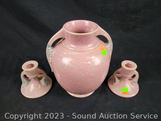 Lot #0210: 3pc 1928 Tuscany Pink Vase & Candleholders