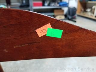 Could use a thorough cleaning, moldy from storage. On rear lower crossbar has some damage from a pet. Otherwise in great condition, some other minor scuffs and wear. If cleaned up believe would be in great condition. 41" H x 19" W x 18" to seat.