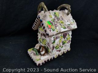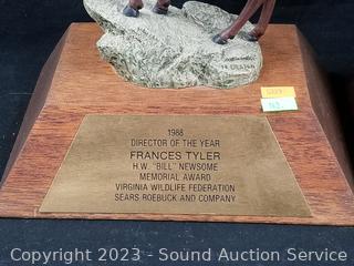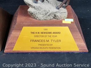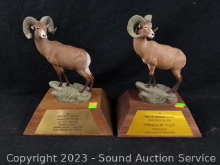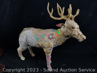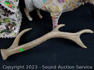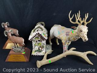 2 Ram Awards, 24" 4-point antler, quilted mixed media Elk sculpture 17" H x 17" L, Pottery Tile House sculpture 12" H x 11" x 7".
