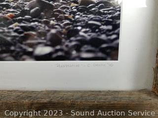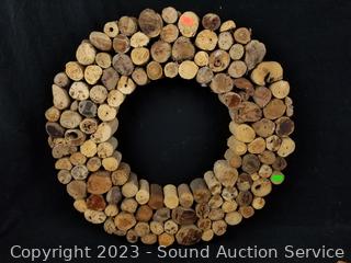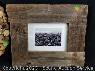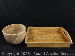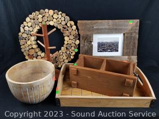 Tree rack, wood bowl, barn wood framed signed beach photo, wreath, tray, shelf.