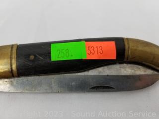 Case XX folding knife, 8.75" long, 3.25" blade, wear from use, very sharp. A.G. Russell lock back folding knife, 8" long, 3.25" blade, excellent condition, very sharp. other unmarked, 9.75" long, 4" blade, signs of wear from use, could use a sharpening.