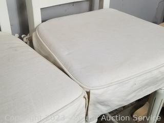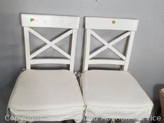 With tie on chair pads. Some minor scuffs, wear to finish. 46" H x 15.5" W x 29" to seat.