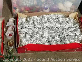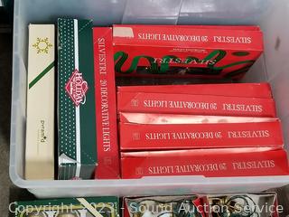 Full of ornaments, lights, various decor. 11" to 16" H x 14" to 16" W x 21" to 22" L totes with lids.