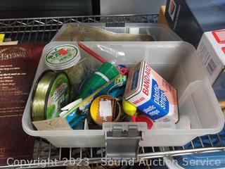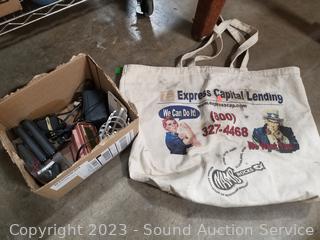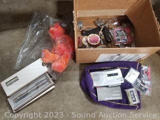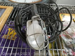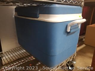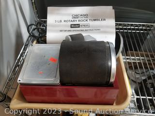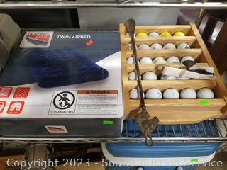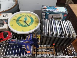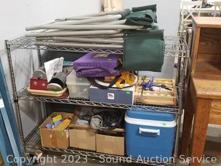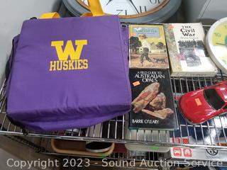 Folding chairs, golf balls, books, cooler, Chicago rock tumbler (works), clock, diecast blue angel, laminator, Huskies stadium seat, drop light & more. ATTN: Items may be missing pieces, damaged, not functioning, complete, no issues, etc. All items as is. Refer to photos for lot contents. Cart NOT included.