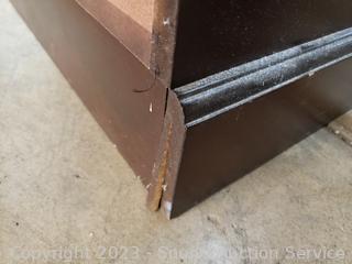 Parts/Repair - top back left side coming apart, carefully when moving. Comes with some file folders. Particle board construction, veneer finish. 29.5" H x 36" W x 15" D. Various scuffs, discoloring, paint residue in finish.