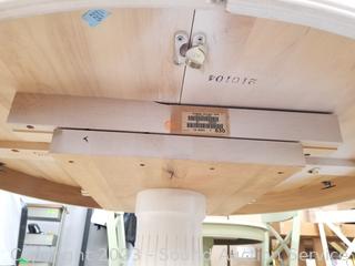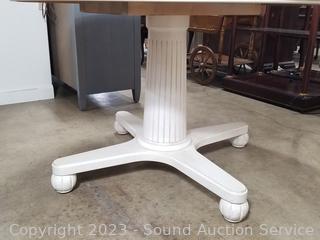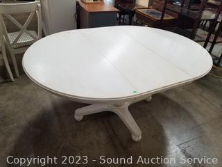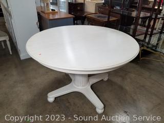 Some minor scuffs & wear to finish. Overall great condition. 30" H x 48" Dia with (1) 18" leaf. Well made. Appears to be solid wood construction.