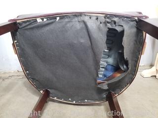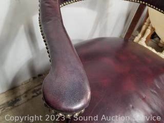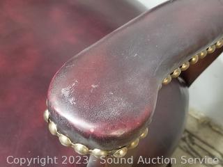 Bottom has a hole exposing the interior, can see it's genuine leather. 31" H x 28" W x 18" to seat. Signs of wear from use, dirty arm rests.