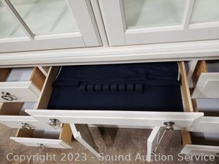 Comes with silvercloth silverware tray. In excellent condition. Mirrored back, 2 glass shelves with plate grooves. 85" H x 63" W x 16.5" D. 2pc for easier movement.
