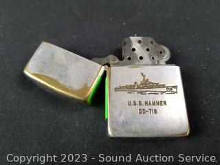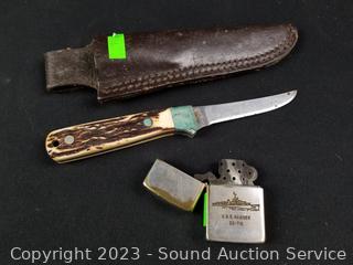 U.S.S. Hamner 1933-54 Zippo lighter. Schrade 7" fixed blade knife with leather sheathe. Some wear from age, use. Sippo needs a new flint.