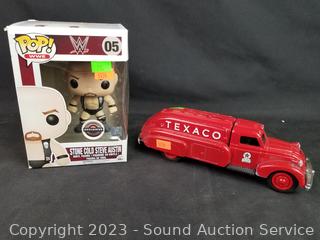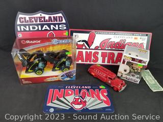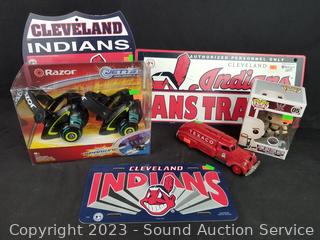 Razor Jetts Heel Wheels, ERTL '39 Dodge Air Flow coin bank (missing key lock trap), Cleveland Indians Signs, Stone Cold Steve Austin #05 Vinyl Funko Pop! figure.