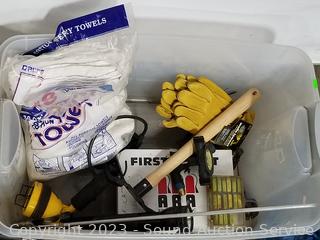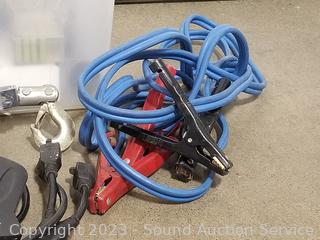 4-way extension cord, ratcheting winch, booster cables, leather gloves, hand towels, fuses, multi-meter & more. Refer to photos for lot contents. ATTN: Items may be missing pieces, damaged, not functioning, complete, no issues, etc. All items as is. Refer to photos for lot contents.