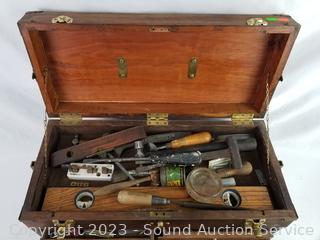2 Drawers inside the face/front panel have been repaired. Full of vintage tools. Refer to photos for lot contents. 13" H x 20" x 9"