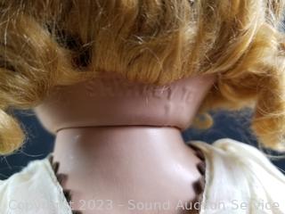 Just marked "Shirley Temple" on back of the neck. Did not see any other marks. Oak & glass display. 20.5" H x 10.25" x 10.25".